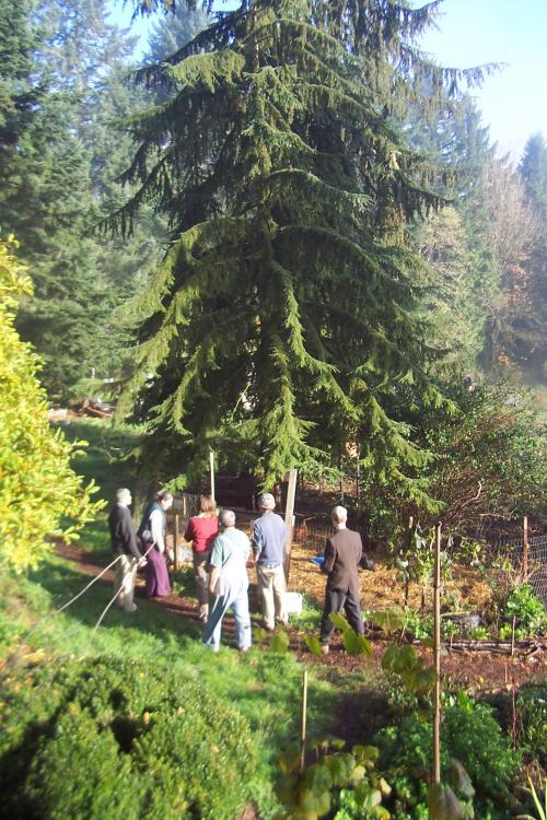 folks walk by tree
